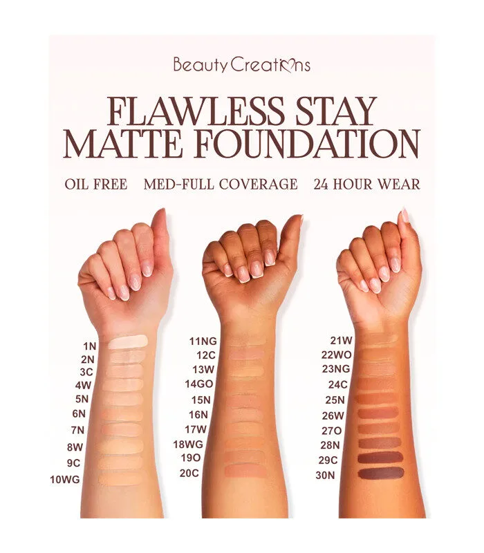 ¡Descubre la perfección de tu piel con la nueva base Flawless Stay Matte Foundation de Beauty Creations! Esta nueva base ha sido reformulada para brindar una cobertura impecable y un acabado mate de larga duración, ideal para pieles mixtas a grasas. Su fórmula ligera, no comedogénica y resistente al agua se adapta a cualquier rutina de maquillaje, dejando un efecto suave, uniforme y sin brillos por hasta 24 horas.