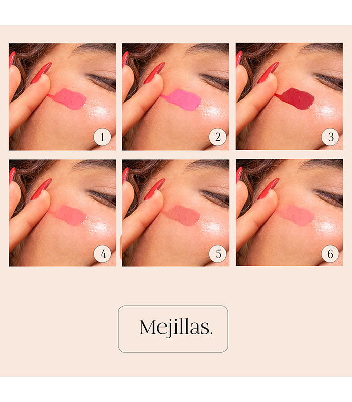 - Tinta multi-usos con 6 tonos en formato crema, puede aplicarse en mejillas, ojos y labios.
