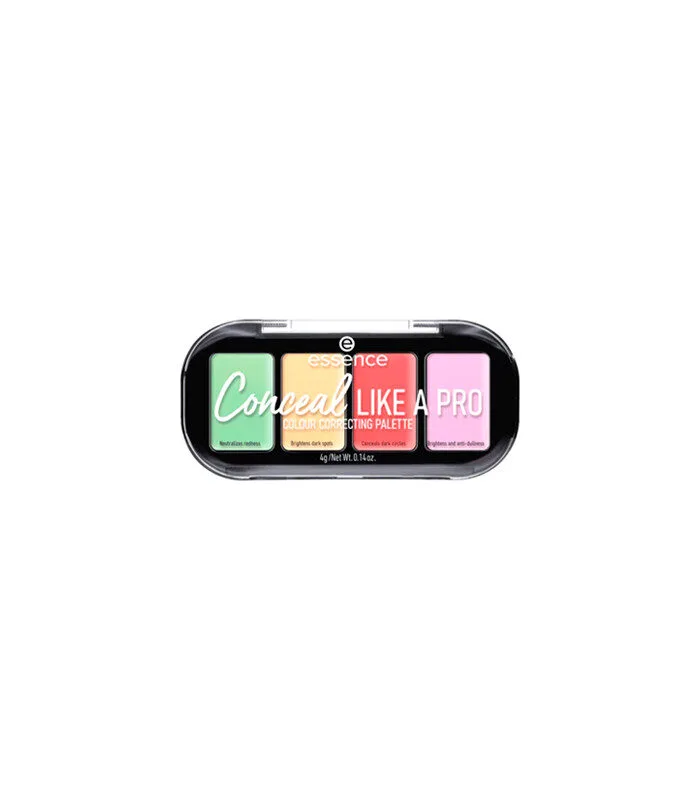 Con sus cuatro tonos correctores de color, la paleta de correctores de color essence CONCEAL like a PRO ¡hace desaparecer todas las imperfecciones! Los correctores suaves y cremosos tienen un efecto instantáneo: el verde neutraliza las rojeces, el amarillo unifica la pigmentación, el rojo cubre las ojeras y el violeta garantiza una tez radiante. ¡No hay nada mejor!