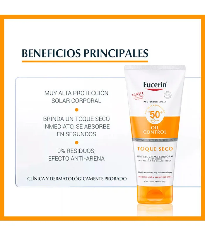 - Eucerin Protector solar ultraligero con textura de gel-crema que se absorbe rápidamente sin dejar residuos y deja un acabado seco al tacto inmediato. Ofrece una completa efectiva y protección para todo tipo de pieles.