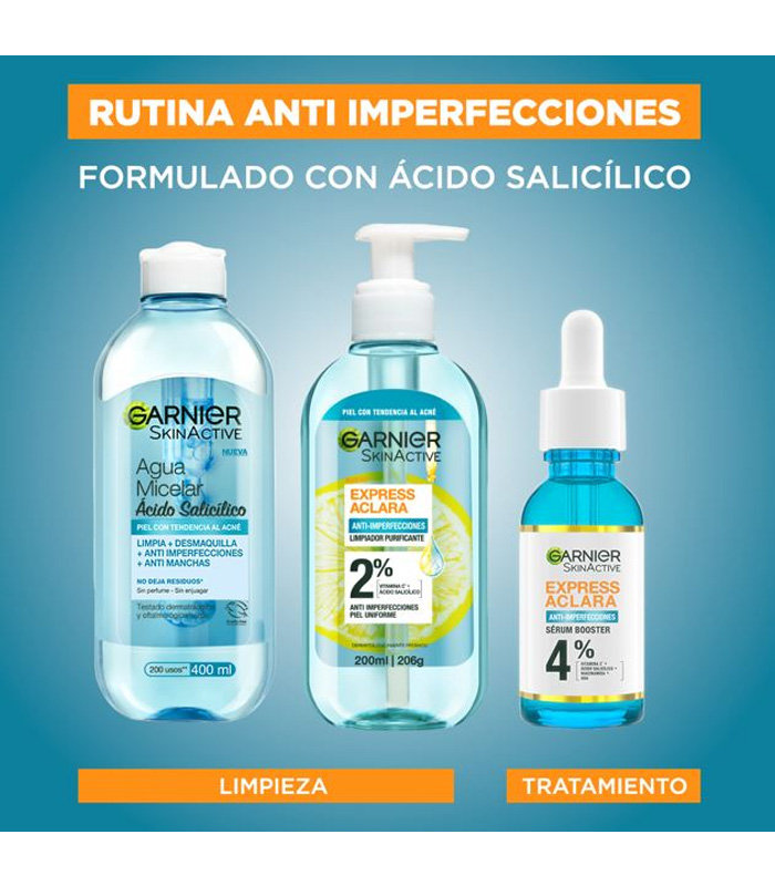Nuevo Gel Limpiador Facial Express Aclara Anti Imperfecciones para piel con tendencia al acné tratamiento concentrado (Ácido Salicílico + Vitamina C), limpiador purificante para reducir imperfecciones y manchas por imperfecciones.