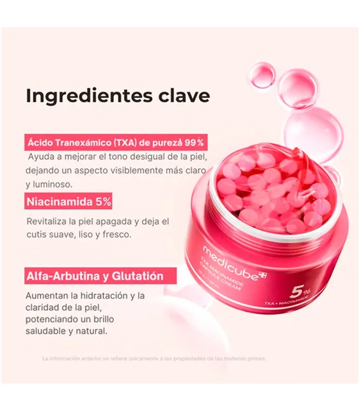 - Una crema rica en TXA y Niacinamida que unifica el tono de la piel y la textura para aclarar e iluminar la piel.