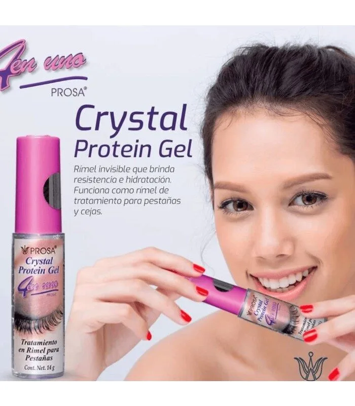 El Prosa Crystal Protein Gel Tratamiento en máscara para pestañas de 18 g es un producto transparente multiuso, diseñado para fortalecer, hidratar y acondicionar pestañas y cejas. Se puede usar como base para el rímel, para un look natural o como tratamiento nocturno.