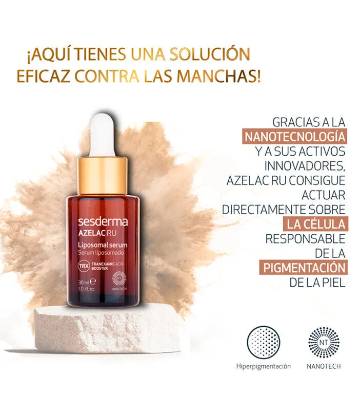 Despigmentante Azelac Ru Serum con activos liposomados que actúan directamente sobre el origen de las manchas cutáneas homogeneizando el tono de la piel. Efecto aclarante, antiinflamatorio y antioxidante, beneficioso incluso para fototipos altos, hiperpigmetnaciones postinflamatorias y melsma.