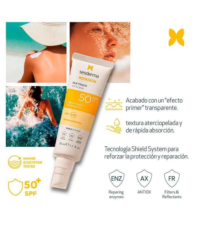 Protector Solar Repaskin Tacto Seda SPF50 te encantará gracias a su innovadora textura sedosa que hace único a este fotoprotector. Se funde a la perfección al contacto con la piel, es ligero y deja un acabado aterciopelado..