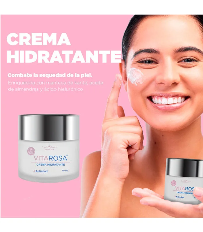 La Crema Hidratante Antiedad Vitarosa de 50 ml es un producto que busca reducir los signos del envejecimiento y aportar luminosidad a la piel, con acido hialuronico, manteca de karite, aceite de almendras.